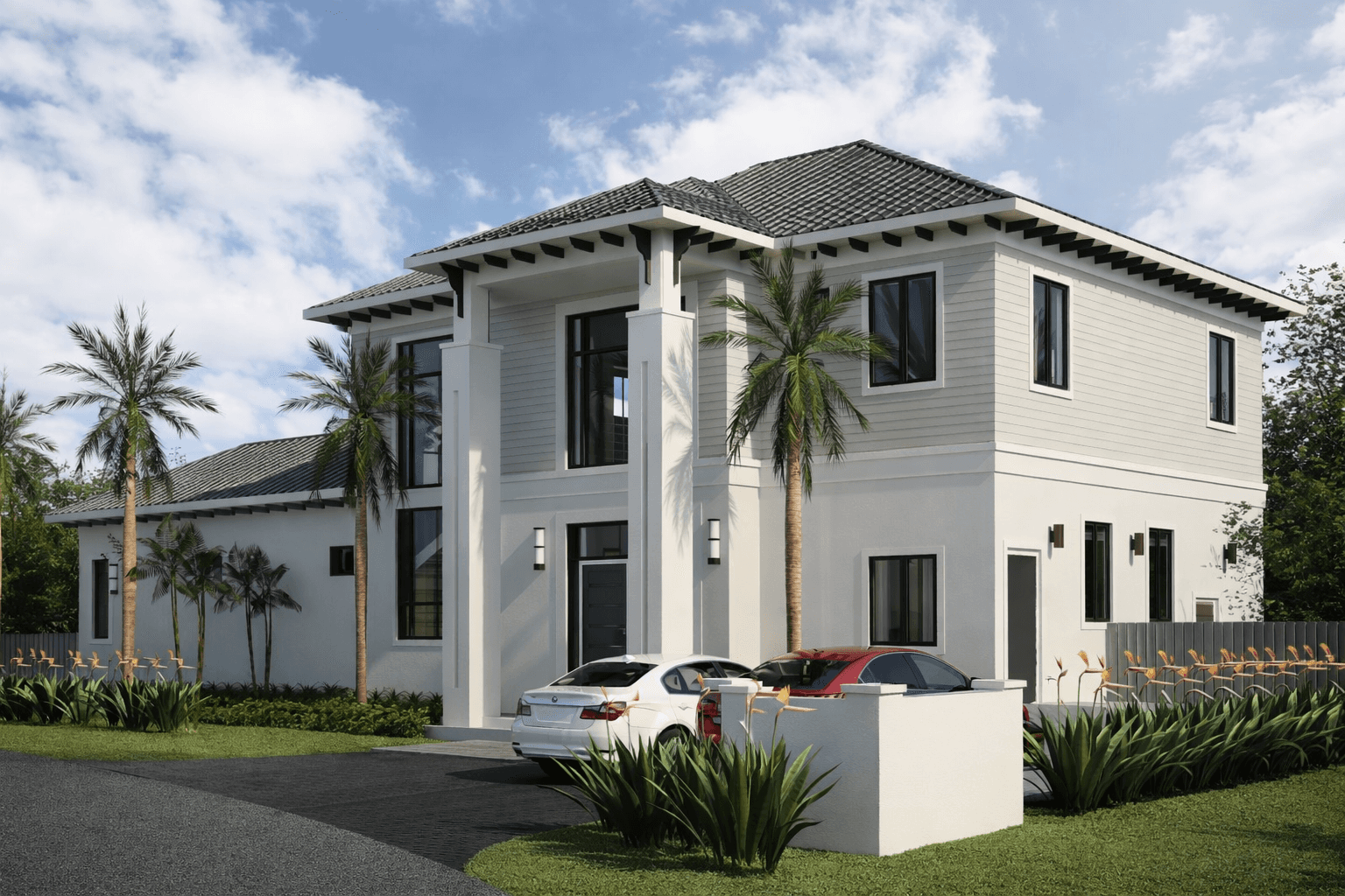 A composition of clean intersecting volumes establishes a strong yet welcoming presence, anchored by a prominent two story entry element balanced by a lower horizontal wing. Deep roof overhangs with exposed rafter detailing provide shade and reference traditional Bahamian architecture in a simplified contemporary form.